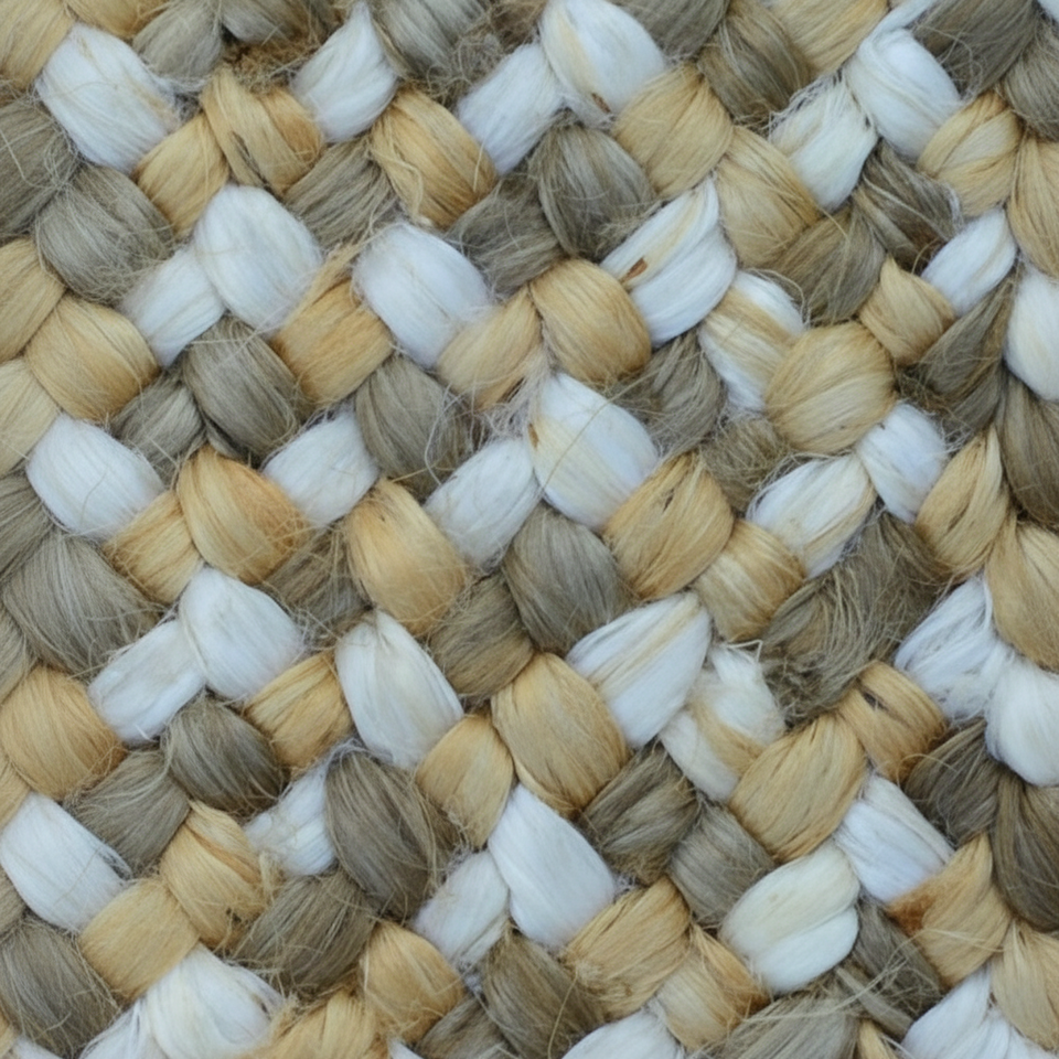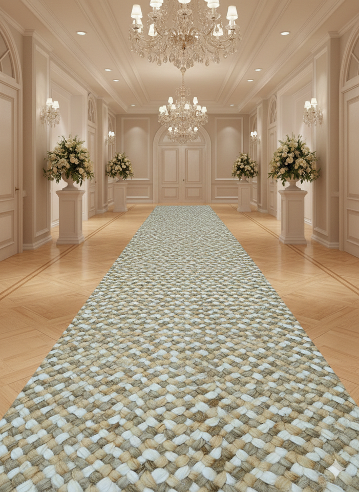 พรมม้วนปูพื้นกันลื่นแบบไร้รอยต่อ ขนาด 4 ม. x 20 ม. ถักด้วยมือจากเส้นใยปอกระเจา สีทองเทา ฟอกขาว ใช้สำหรับละหมาด