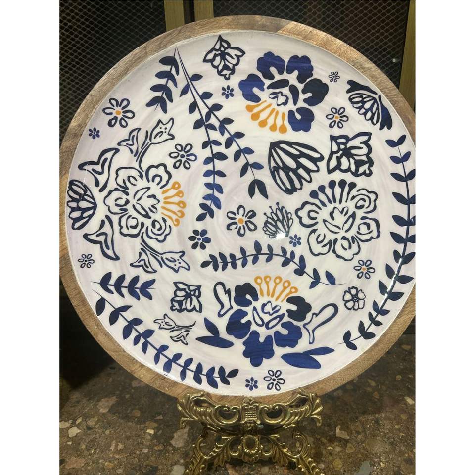 จานเสิร์ฟเคลือบลายดอกไม้ทรงกลมขนาด 12 นิ้ว ทำจากไม้มะม่วง เป็นมิตรต่อสิ่งแวดล้อม - ถาดไม้เคลือบเอนาเมล ทนทาน