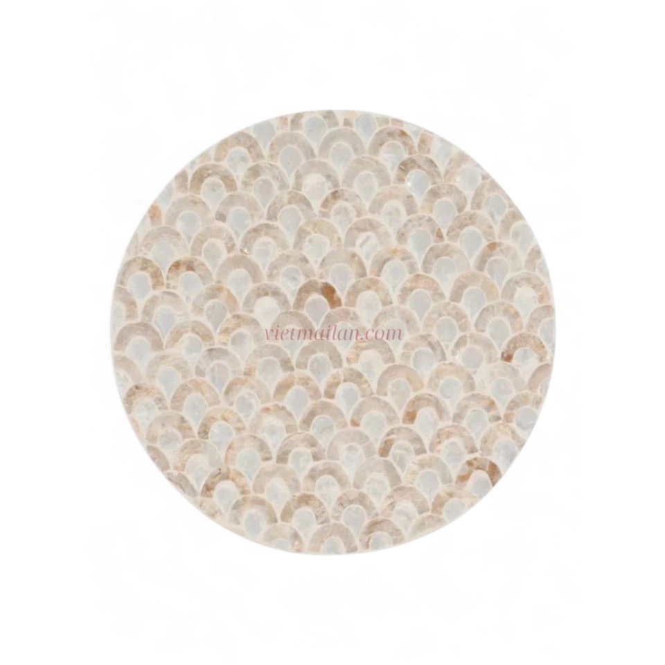 แผ่นรองจานทรงกลมทำจากเปลือกหอยมุก เป็นมิตรกับสิ่งแวดล้อม ขายส่งสำหรับร้านตกแต่งบ้านและใช้บนโต๊ะอาหาร จากประเทศเวียดนาม