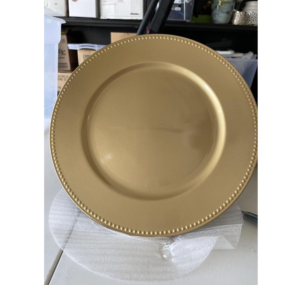 แผ่นที่ชาร์จสแตนเลสสีทองหรูหราเป็นมิตรกับสิ่งแวดล้อมสำหรับงานแต่งงานและงานอีเวนต์ที่เปล่งประกายเหนือกาลเวลา