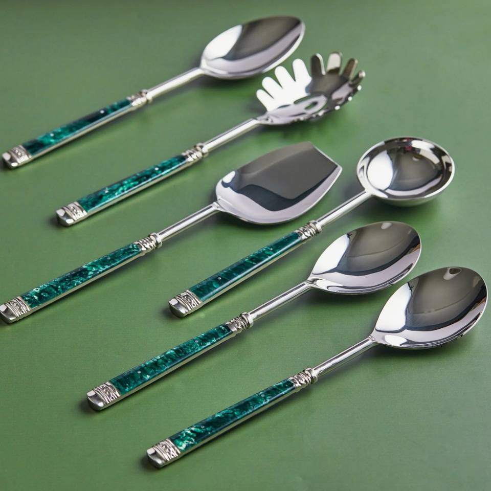 ชุดเครื่องใช้บนโต๊ะอาหารสแตนเลสเป็นมิตรกับสิ่งแวดล้อมพร้อมด้ามจับเรซินหรูหราทันสมัยออกแบบโลโก้งานแต่งงานให้เป็นของขวัญ
