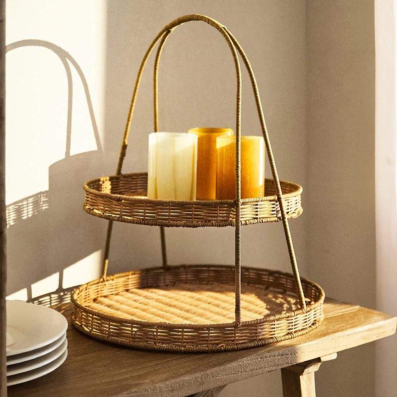 เป็นมิตรกับสิ่งแวดล้อม & ไร้กาลเวลาตะกร้าผลไม้มีสไตล์ถาดหวาย2ชั้นออกแบบมาเพื่อทั้งสองฟังก์ชันการทำงาน