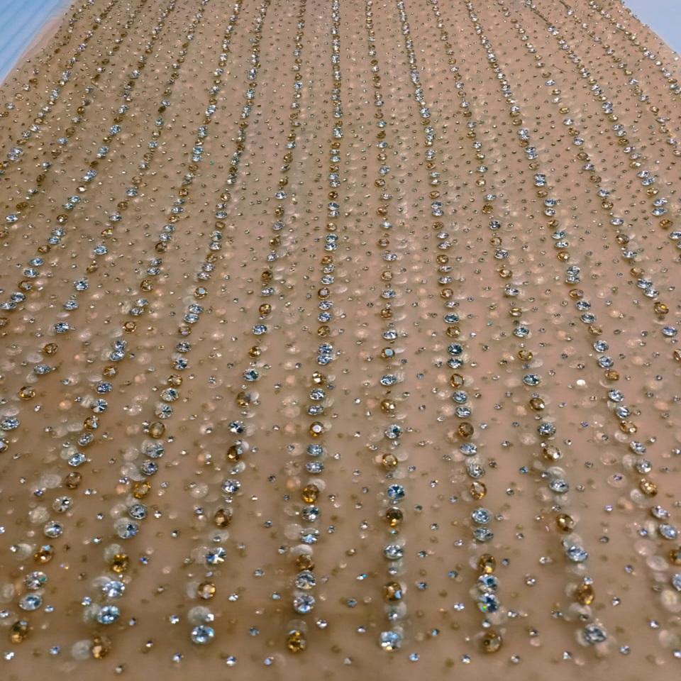 ผ้าลูกไม้ตาข่ายทูลล์ประดับมุกหรูหราแบบดั้งเดิมที่เป็นมิตรต่อสิ่งแวดล้อม ประดับด้วยคริสตัลและเพชร ออกแบบเองได้ งานหนัก ทำด้วยมือ