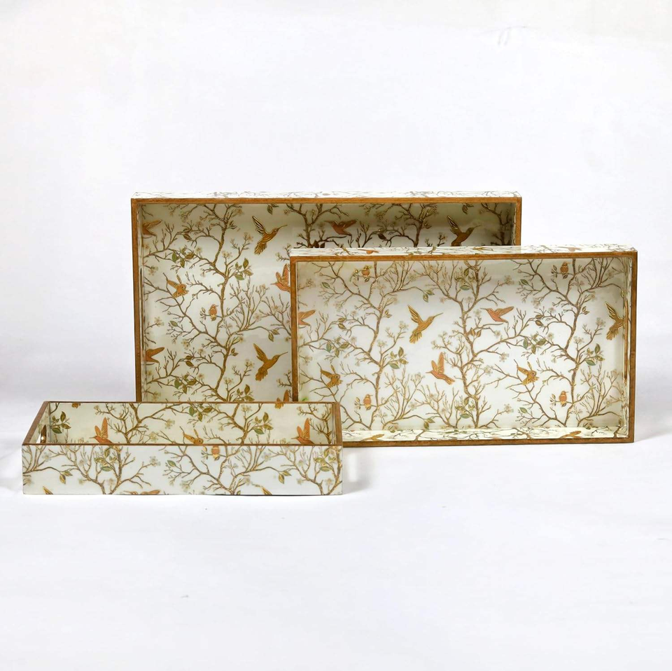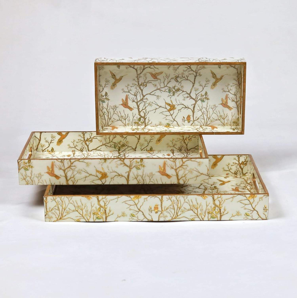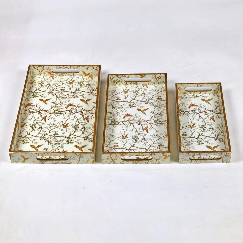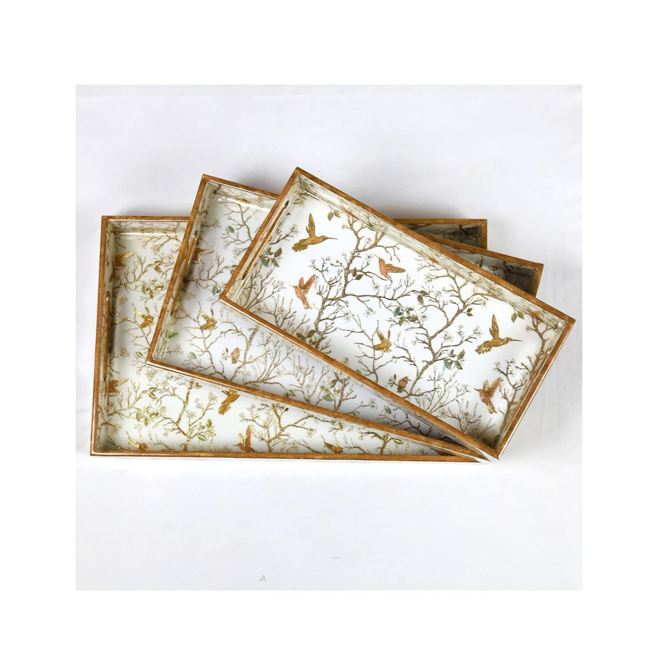 ถาดไม้ขัดเงาสำหรับตกแต่งห้องครัวและรับประทานอาหารพิมพ์ลายนกสีขาวทองเป็นมิตรกับสิ่งแวดล้อมพร้อมงานฝีมือรูปพระจันทร์เสี้ยว