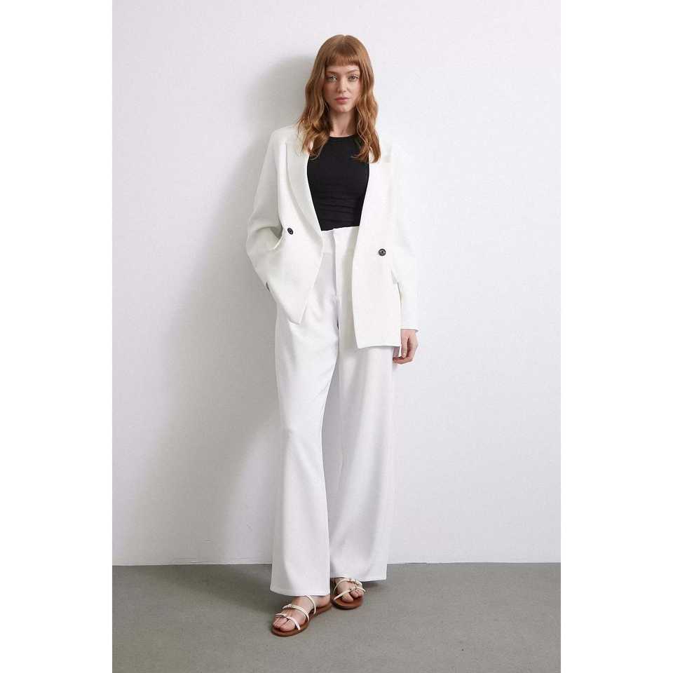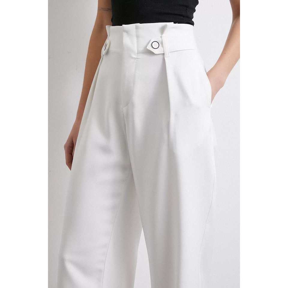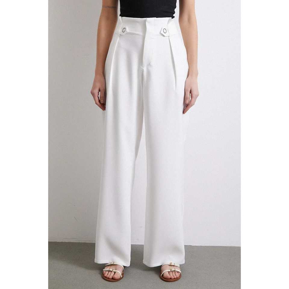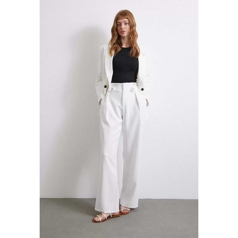 กางเกงขายาวทรงกว้างเอวสูง ผ้าเครป ยับยาก สีเอครู เป็นมิตรต่อสิ่งแวดล้อม สำหรับผู้หญิง