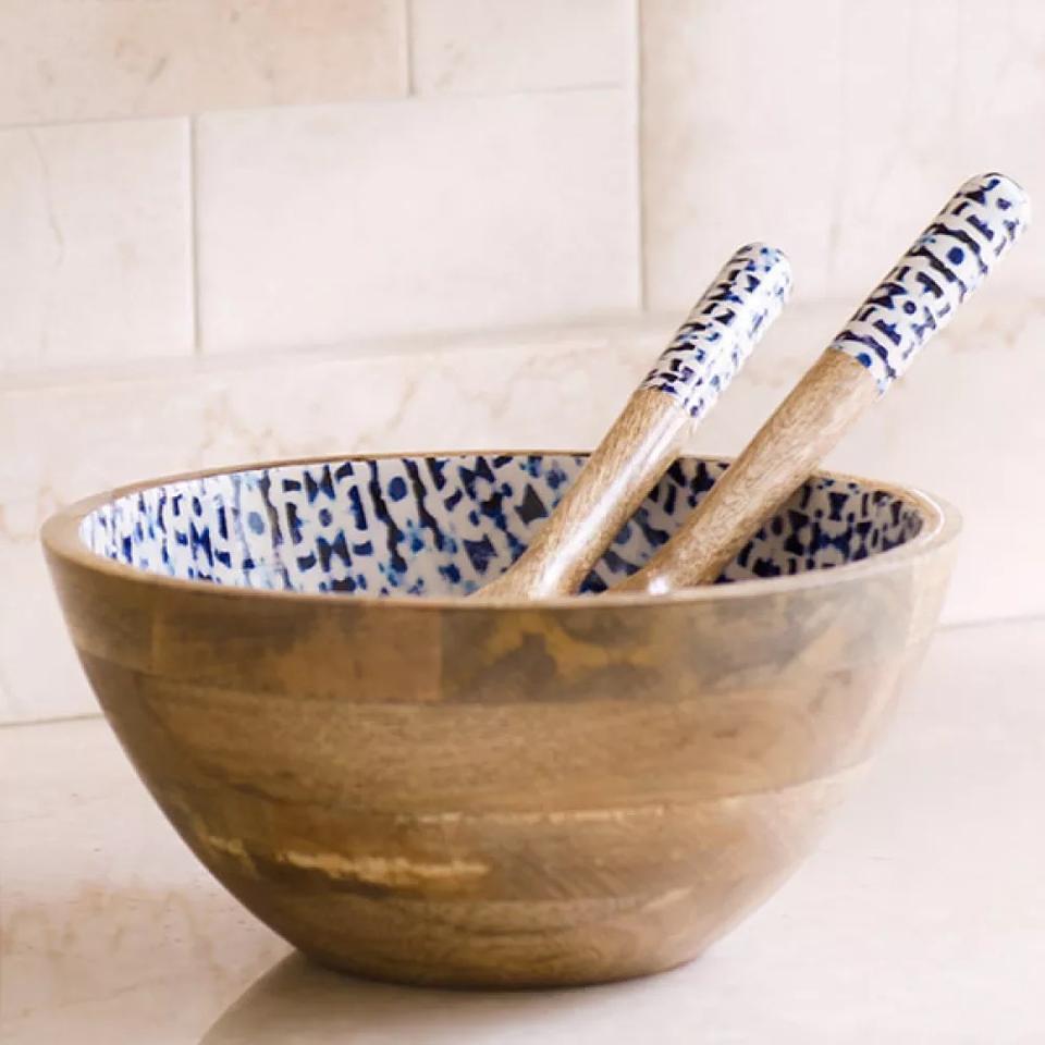 ชุดชามสลัดไม้รักษ์โลกพร้อมช้อนสลัดสแตนเลส ชุดชามเสิร์ฟ อุปกรณ์ครัว ชุดช้อนส้อมไม้สำหรับเสิร์ฟสลัด