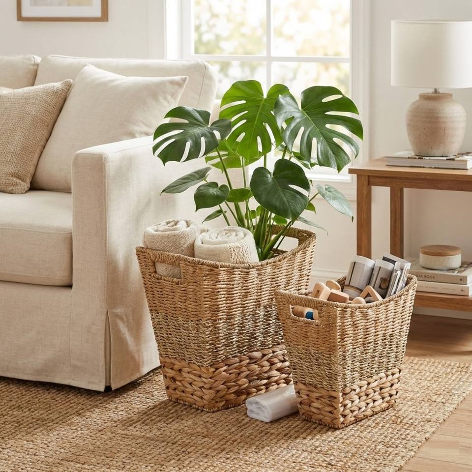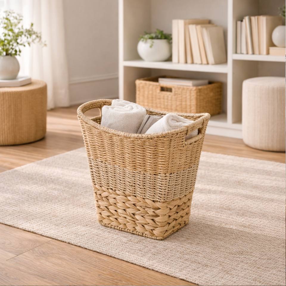 ตะกร้าเก็บของจากผักตบชวาแบบทอ เป็นมิตรกับสิ่งแวดล้อม พร้อมหูหิ้ว สไตล์เรียบง่ายอเนกประสงค์สำหรับใช้ในบ้าน