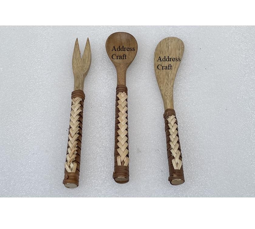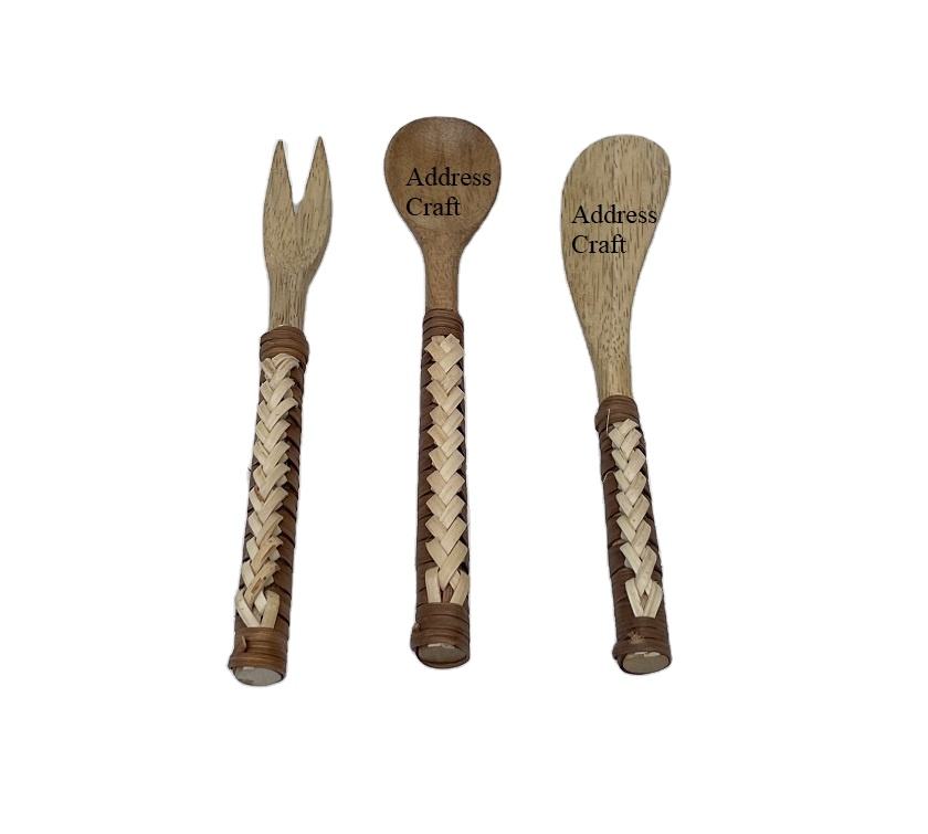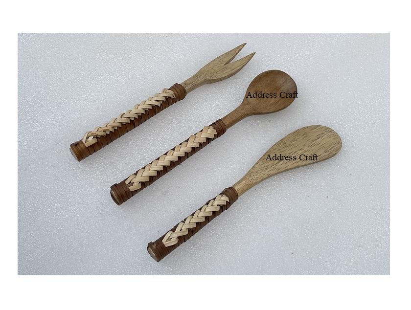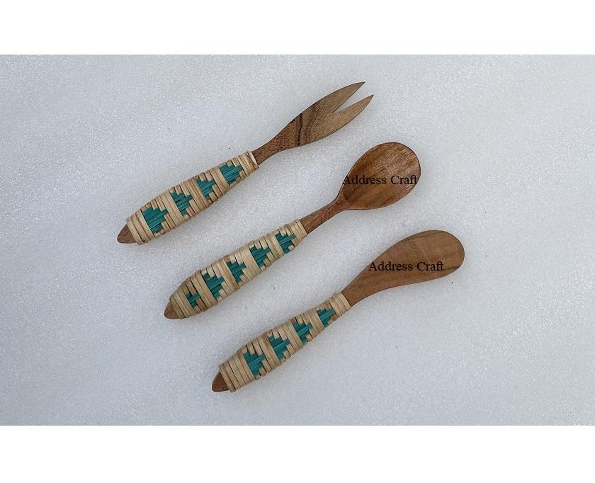 Eco Material Butter Knives Wooden Cheese Knife Fruit Fork With Hand Woven Rattan Handle Best Seller Wicker Handle Spoon Cutlery