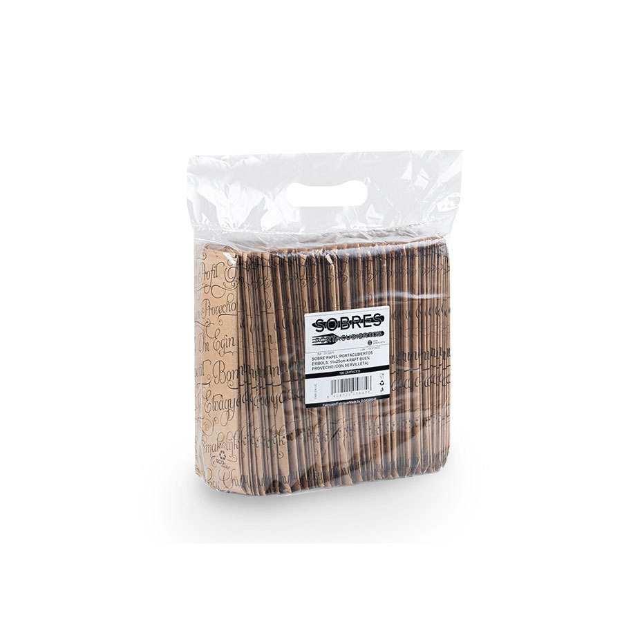 ซองใส่ช้อนส้อมพิมพ์ลาย Buen Provecho ขนาด 11x25 ซม. พับได้ 1/6 พร้อมกระดาษเช็ดปาก กระดาษคุณภาพสำหรับมืออาชีพ บรรจุในถุง สำหรับธุรกิจ B2B