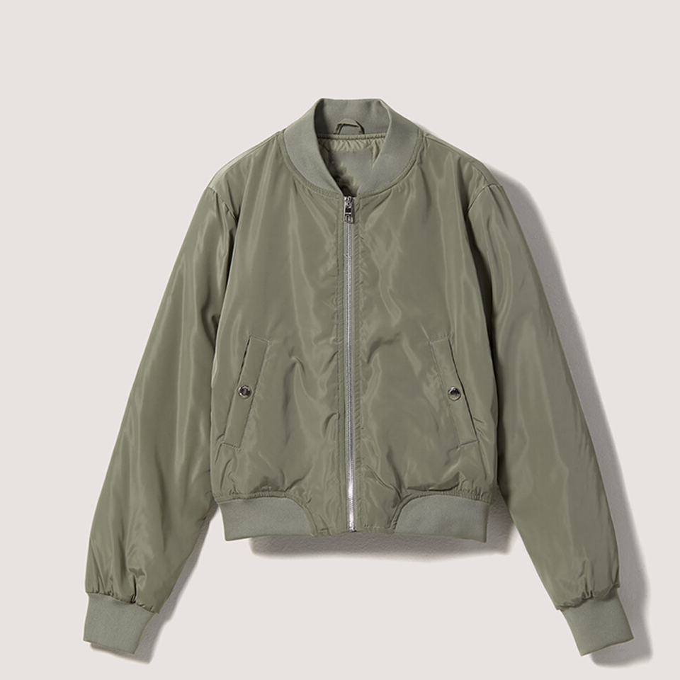 เสื้อแจ็คเก็ตบอมเบอร์แบบครอป ย้อนกลับด้านได้ กันน้ำ บุด้วยผ้าฝ้ายแบบควิลท์ รุ่น Eco Smart Unisex สีกากี/เขียวมะกอก สไตล์สตรีทแวร์ ซิปหน้า ลำลอง
