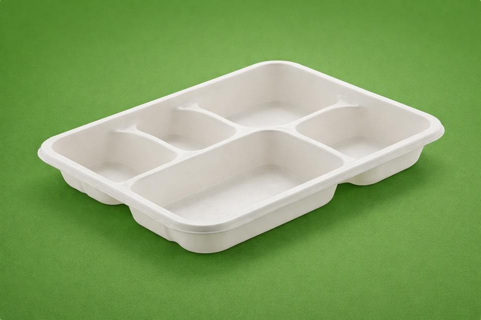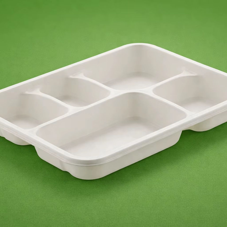 ถุงชานอ้อยแบบใช้แล้วทิ้ง ย่อยสลายได้ 100% เป็นมิตรกับสิ่งแวดล้อม รีไซเคิลได้ 5 ช่อง ใช้กับไมโครเวฟได้ น้ำหนักเบา เหมาะสำหรับงานปาร์ตี้
