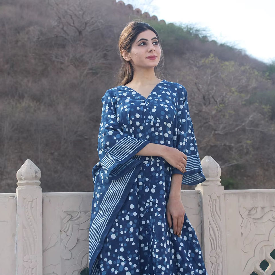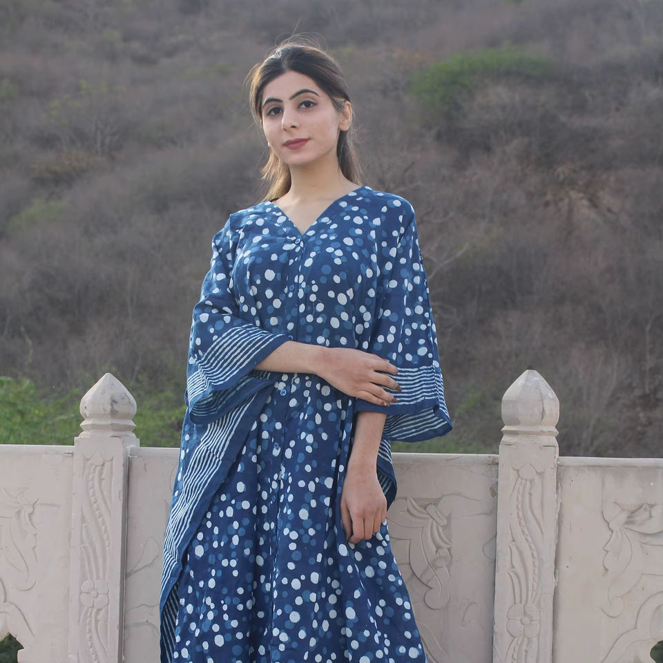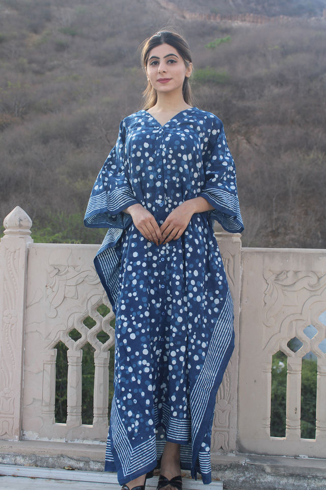 ชุดเดรสคาฟตันยาวคลุมเข่าผ้าฝ้าย100% เป็นมิตรกับสิ่งแวดล้อมชุดเดรสลำลองสวมใส่สบายเสื้อผ้าใส่ในเลานจ์ลายบล็อกมือหรูหราดีไซน์แบบอินเดีย