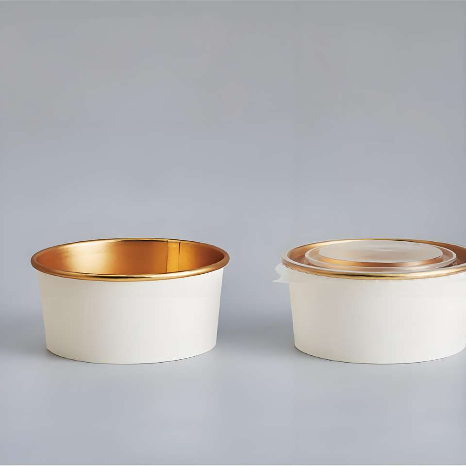 ชามใส่อาหารแบบกระดาษฟอยล์สีทองแบบใช้แล้วทิ้งชามใส่อาหารเกรดอาหารชามอาหารซูชิกระดาษพร้อมฝาปิดเป็นมิตรกับสิ่งแวดล้อม