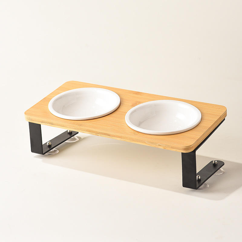 ชามเซรามิกยกสูงสำหรับแมวและสุนัขขนาดเล็ก เป็นมิตรกับสิ่งแวดล้อม พร้อมขาตั้งไม้จริง ชุดภาชนะใส่อาหารสำหรับแมวและลูกสุนัข