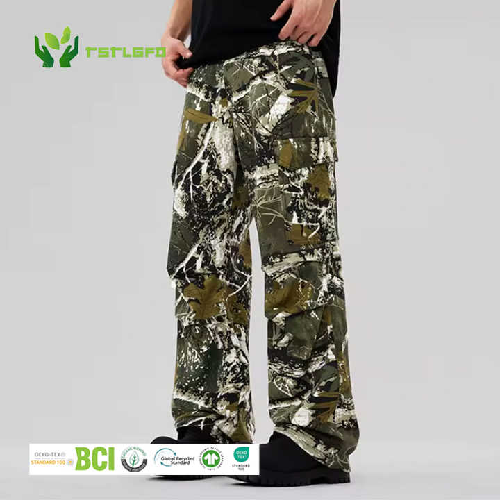 กางเกงคาร์โก้ลายพรางต้นไม้พิมพ์ลายทั้งตัว ผ้าฝ้ายออร์แกนิค 100% น้ำหนักปานกลาง เป็นมิตรกับสิ่งแวดล้อม ตกแต่งด้วยผ้าปะติด สำหรับผู้ชาย เอวยางยืด ขากว้าง