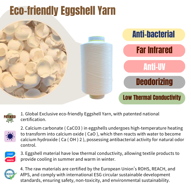 เส้นด้ายเปลือกไข่ธรรมชาติรักษ์โลก ป้องกันแบคทีเรียและรีไซเคิลได้ ผสมเส้นใยสแปนเด็กซ์/ไนลอน ป้องกันรังสีอินฟราเรดและรังสียูวี สำหรับงานเย็บผ้า