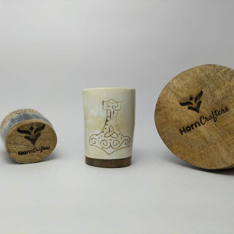 ฮอร์นแก้วไวกิ้งสีขาวพร้อมค้อนธอร์แกะสลักทำจากเขา100% ธรรมชาติเป็นมิตรกับสิ่งแวดล้อม