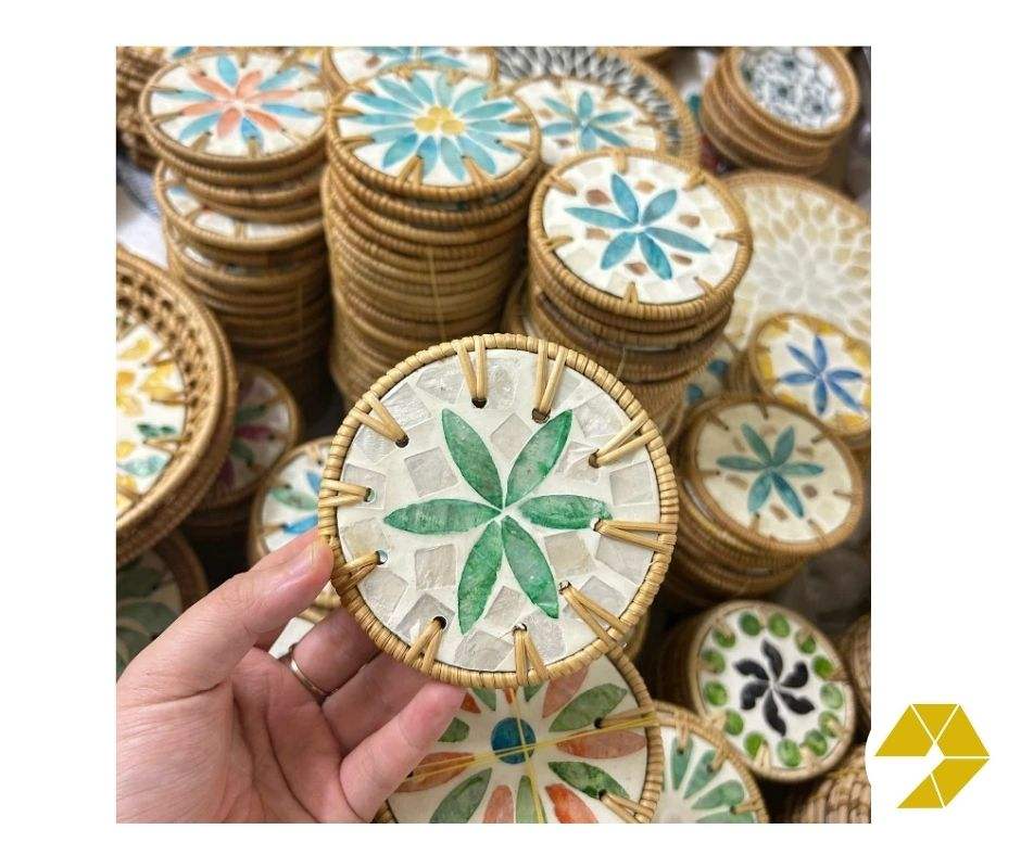 ชุดตกแต่งห้องอาหารที่เป็นมิตรกับสิ่งแวดล้อม ประกอบด้วยจานหวาย แผ่นรองจานรูปเปลือกหอย แผ่นรองแก้วลายมุก จานหวาย