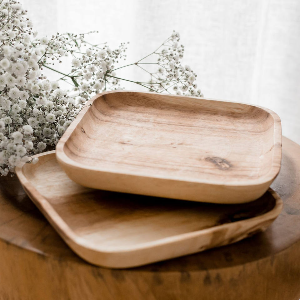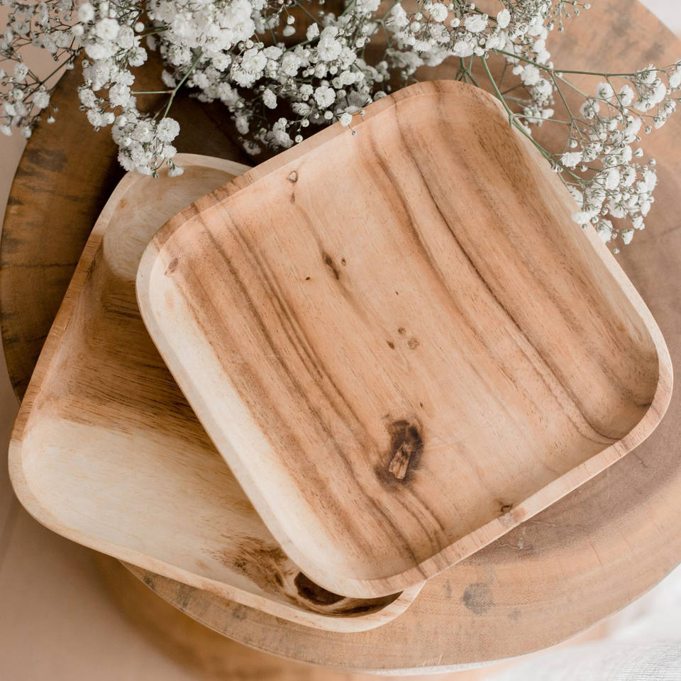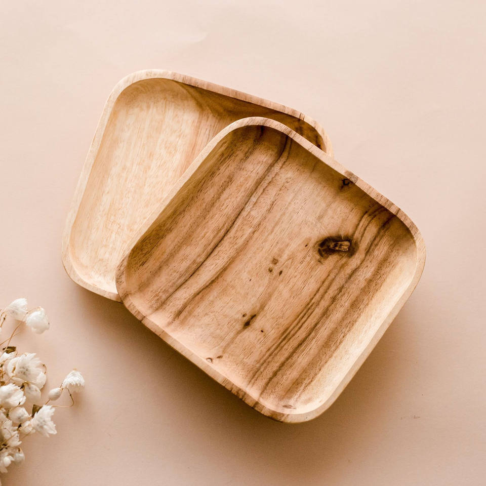 จานไม้ทรงสี่เหลี่ยมเป็นมิตรกับสิ่งแวดล้อมสำหรับมื้ออาหารชุดจานทำจากไม้ธรรมชาติ