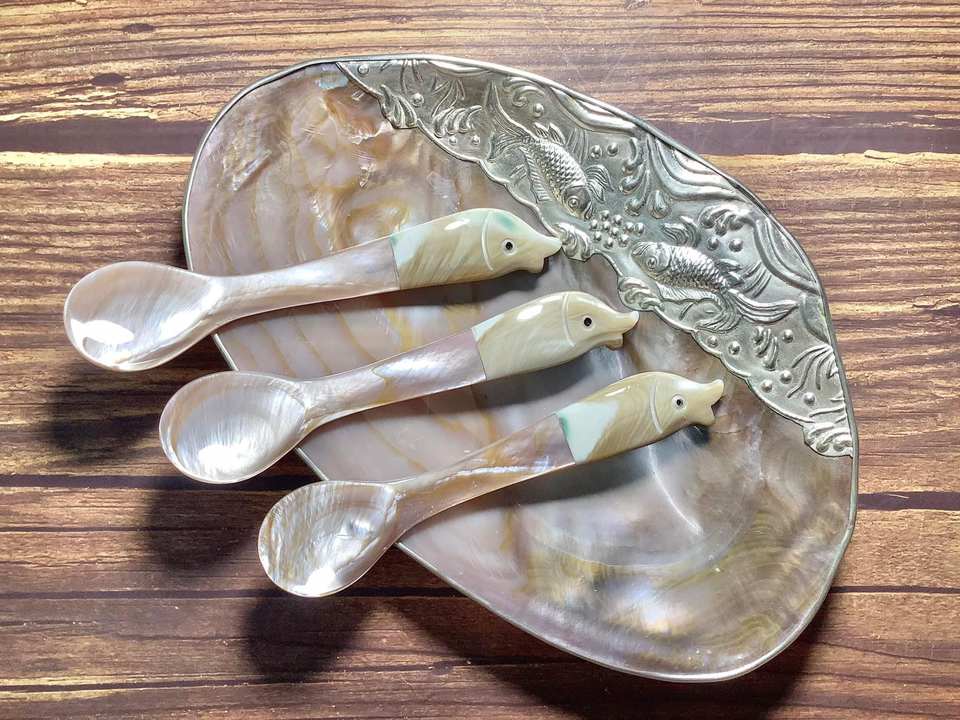 Eco friendly wooden spoon paired with seashell spoon and mother of pearl seashell great for caviar butter or dessert use