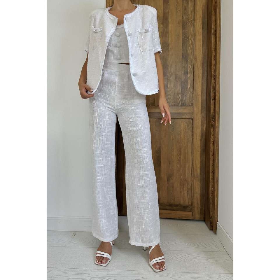 ชุดผ้าลินินสีขาวสำหรับผู้หญิงของอีโคชิคกางเกงและแจ็คเก็ตแขนสั้นลำลองระบายอากาศได้ดีสีเอครูไซส์ M