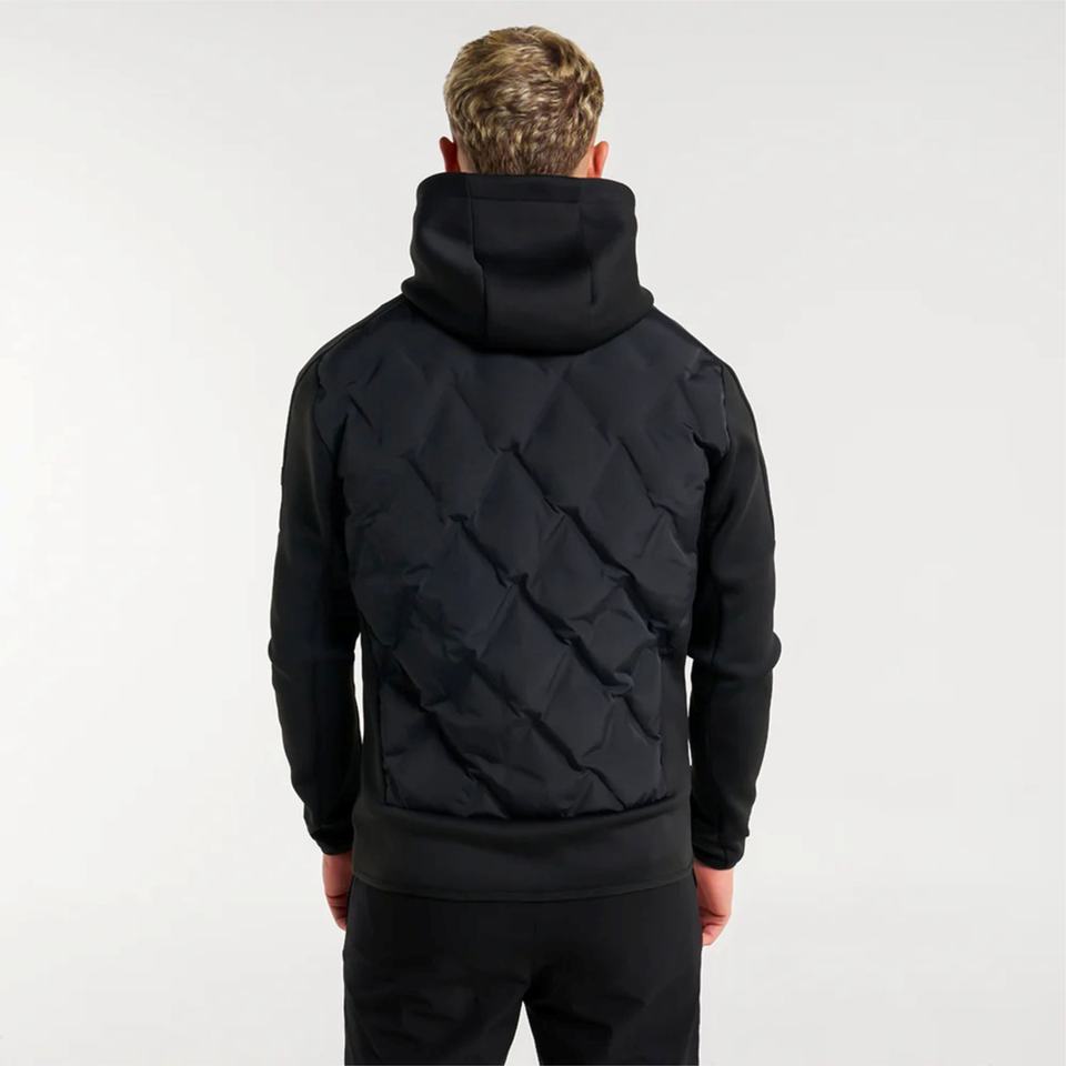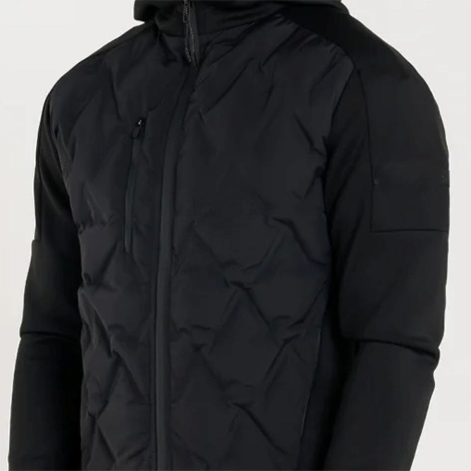 Econex เสื้อแจ็คเก็ตไฮบริดลายควิลท์เชฟรอนสีดำ2025กีฬาสไตล์สปอร์ตพร้อมแขนนีโอพรีนออกแบบให้มีฮู้ดและซิปล็อกได้อย่างทนทาน