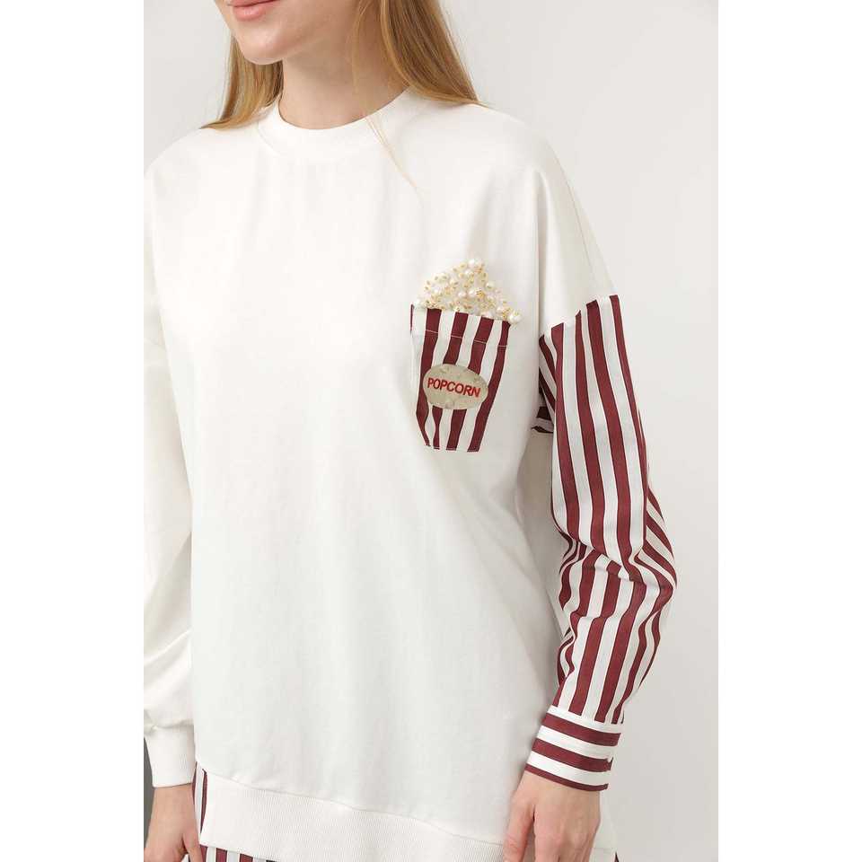 Ecrue เสื้อคอลูกเรือผู้หญิงสีกรมท่าคอผ้าป๊อบคอร์นพิมพ์ลายสีคมชัด
