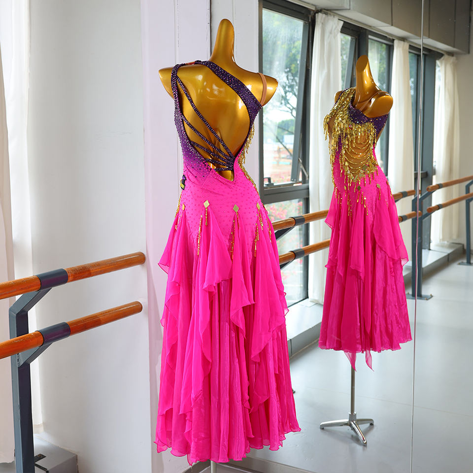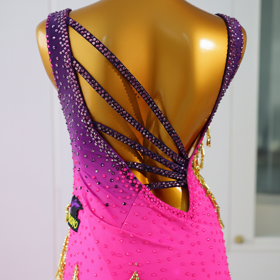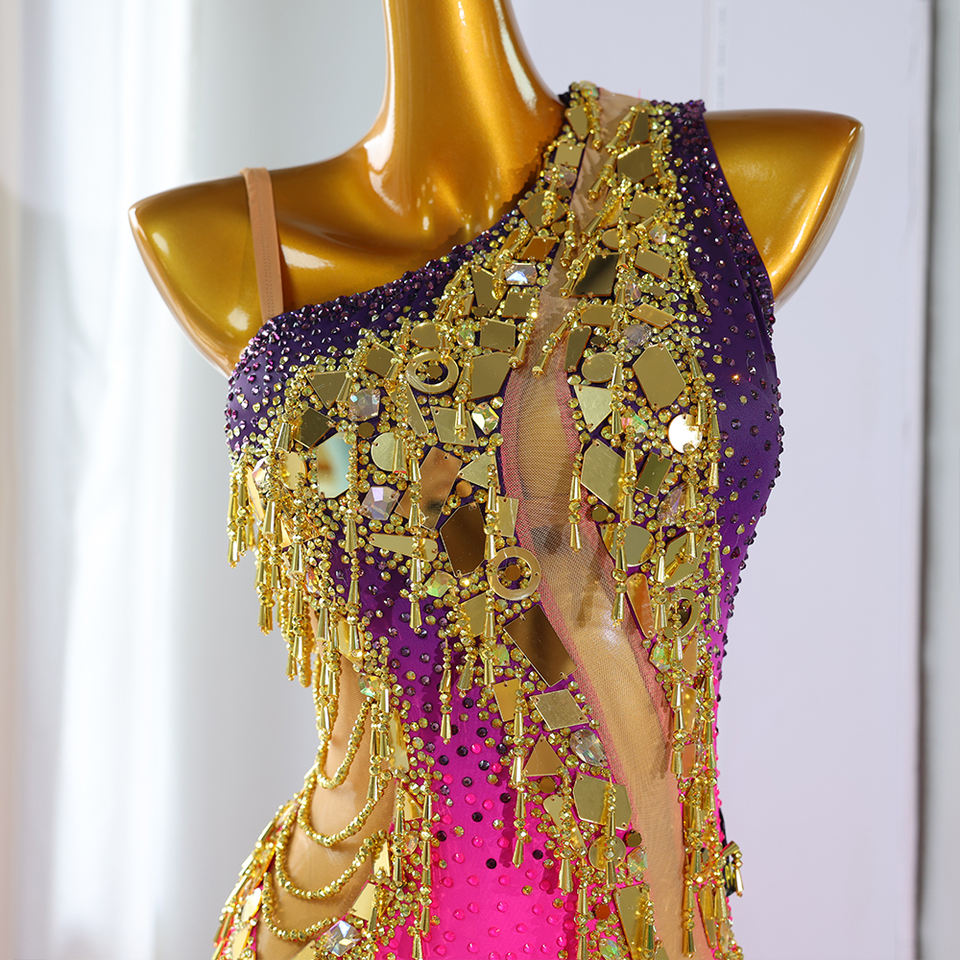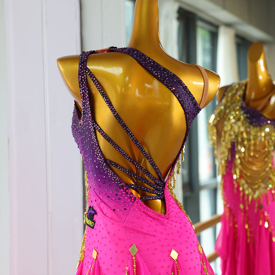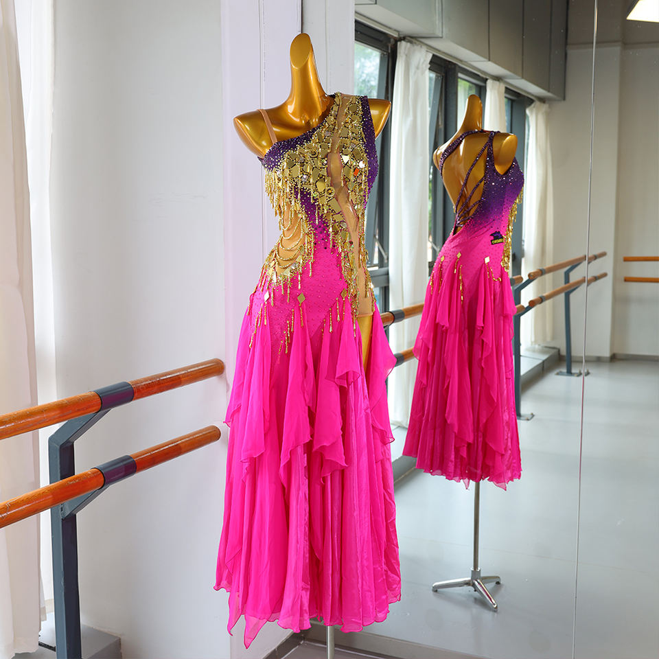 ชุดเต้นรำลาตินสีชมพูสดหรูหราสำหรับเด็กและผู้หญิง ประดับด้วยลูกปัดสีทอง ชุดแสดงบอลรูมระดับมืออาชีพ ผลิตจากโพลีเอสเตอร์ 100%