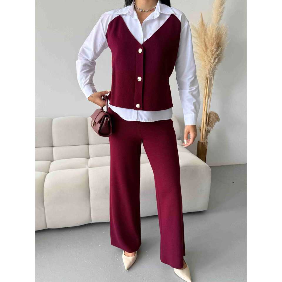 ชุดเสื้อสเวตเตอร์ถักขอบลาย ไซส์ S สำหรับผู้หญิง สีแดงเลือดหมู เสื้อกั๊กคอวี กางเกงขายาว