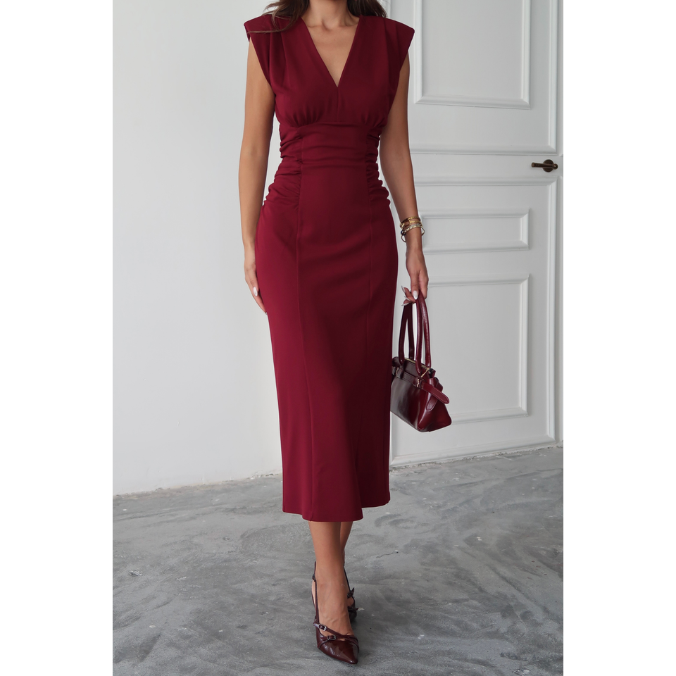 เดรสไหมพรมคอวีสีแดงเบอร์กันดี แต่งระบายข้าง รุ่น Edge V-Neck Scuba Dress สำหรับผู้หญิง