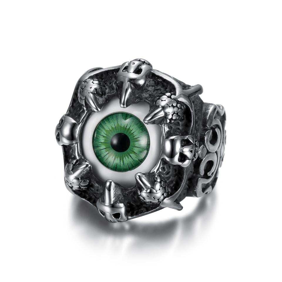 แหวนรูปหัวกะโหลกและกรงเล็บลายตาปีศาจสีเขียว/น้ำเงินหลากสี ชุบทอง ทำจากสแตนเลสสตีล 316L เครื่องประดับพังก์สำหรับผู้ชาย ของขวัญสำหรับเขา