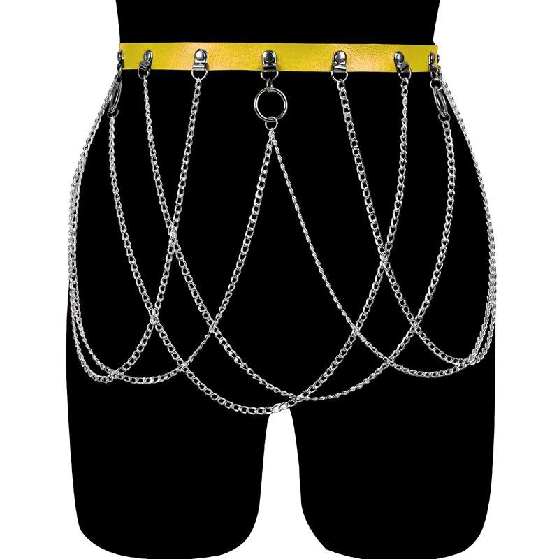 เข็มขัดหนังเทียมแบบเซ็กซี่ ดีไซน์ทันสมัย ประดับโซ่โลหะหลายชั้น เครื่องประดับร่างกาย สไตล์โกธิค สำหรับงานเรฟและคลับแวร์