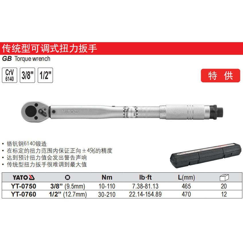 ประแจวัดแรงบิดแบบปรับได้ Eertuo 1/2 นิ้ว ผลิตจากเหล็กโครเมียมวาเนเดียม สำหรับซ่อมรถยนต์ รุ่น YT-0750