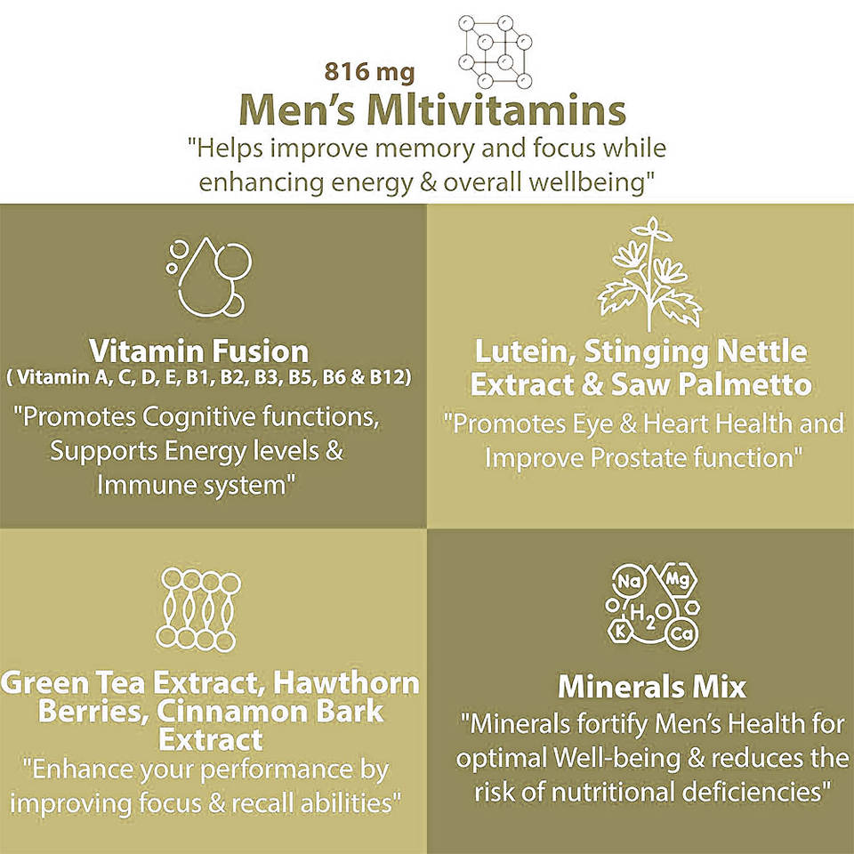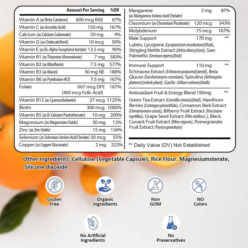 วิตามินเอ, วิตามินซี, วิตามินดี, วิตามินอี, วิตามิน B1, วิตามิน B2, วิตามิน B3, วิตามิน B6, โฟเลต, วิตามิน B12, ไบโอติน, วิตามิน B5, ซีลีเนียม, ทองแดง, แมกนีเซียม, สังกะสีส่วนผสมหลัก