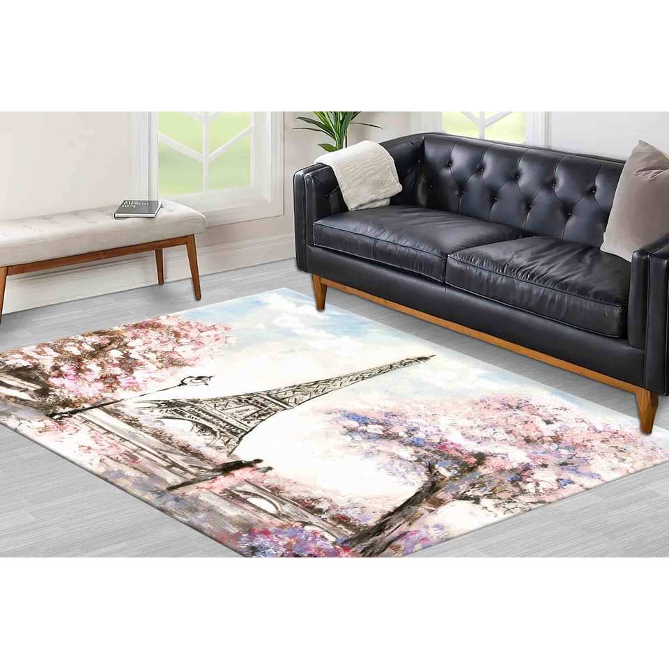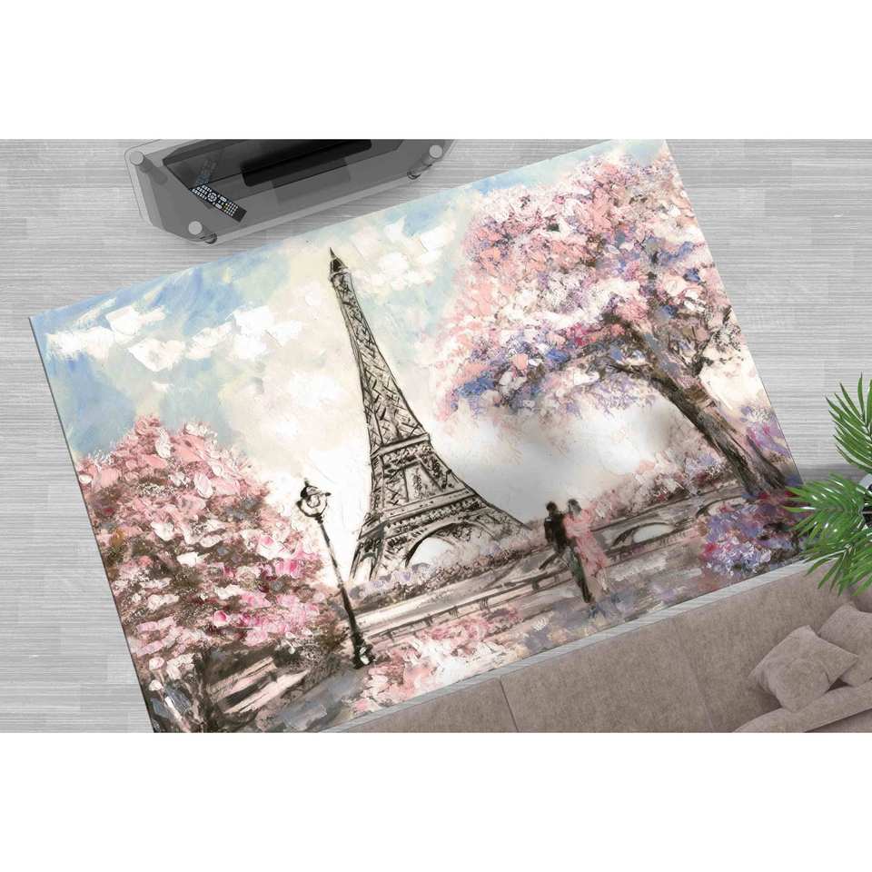 Eiffel Tower Rug: Pink Leaves Tree, Romantic Paris Decor,Chenille Rug