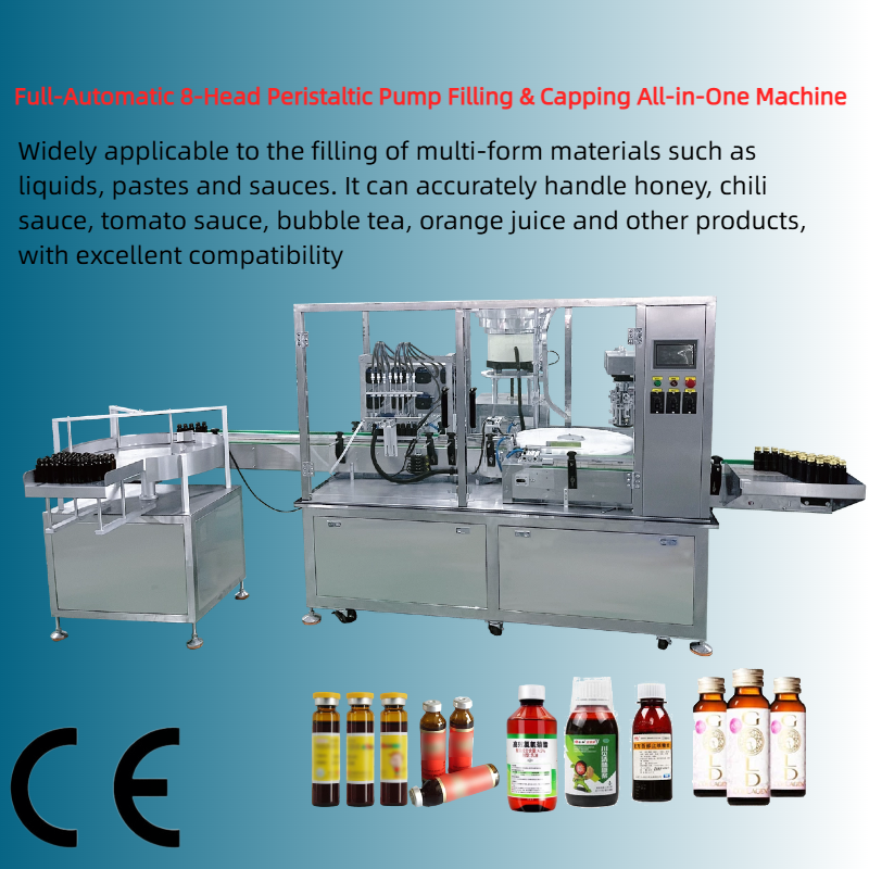 ชื่ออุปกรณ์:เครื่องบรรจุและปิดฝาแบบอัตโนมัติเต็มรูปแบบ 8 หัวด้วยปั๊มเพอริสแตลติก