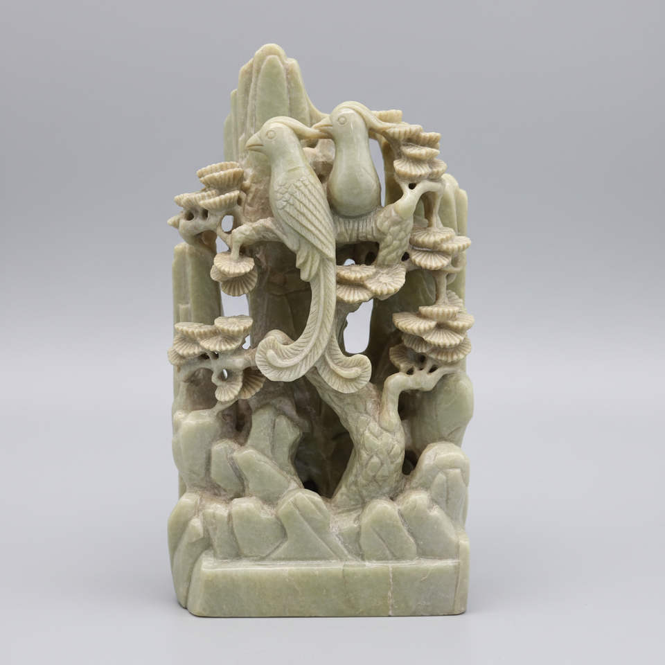 แกะสลักหินสบู่สีเขียวอ่อนอย่างประณีตพร้อมนกที่อยู่ในต้นไม้ที่มีรายละเอียดมีจำหน่ายในราคาขายส่ง
