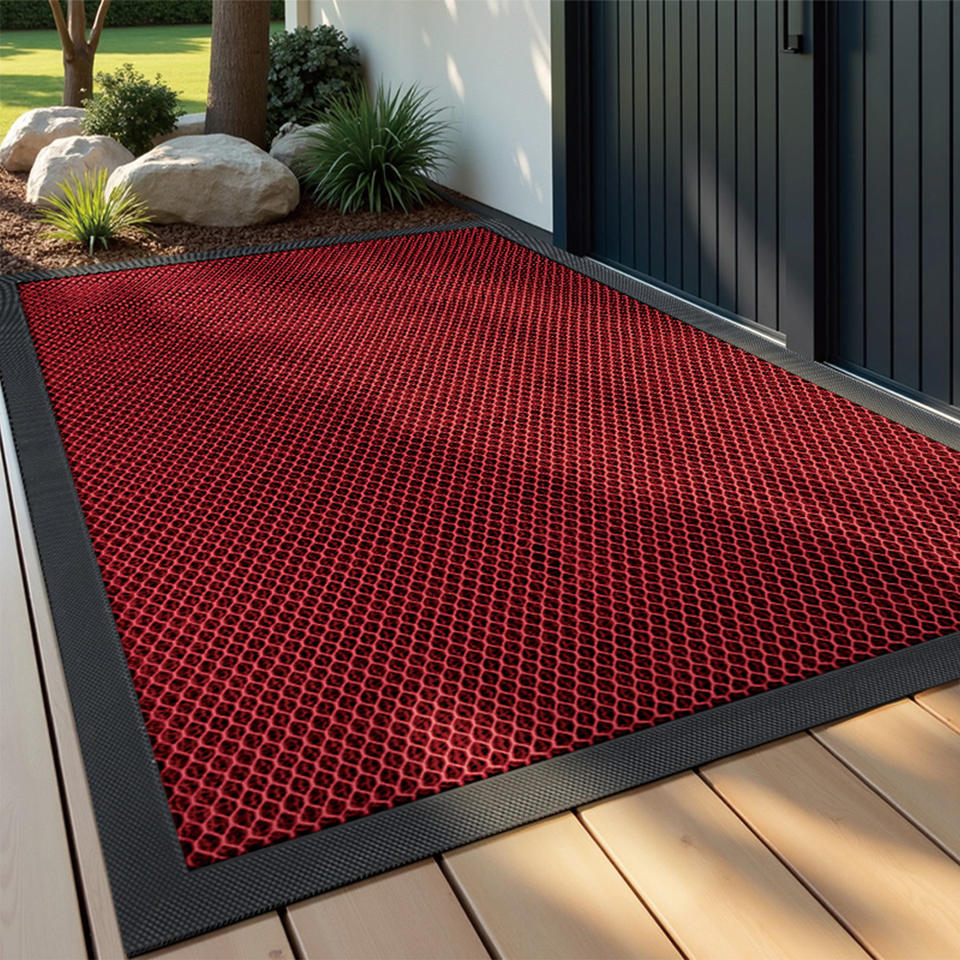 พรมเช็ดเท้าแบบยืดหยุ่นสีแดงรูปสี่เหลี่ยมผืนผ้า PVC ลายเรขาคณิต กันลื่น ทนทานต่อการสึกหรอ ใช้สำหรับทางเข้าบ้านหรือโถงทางเดิน