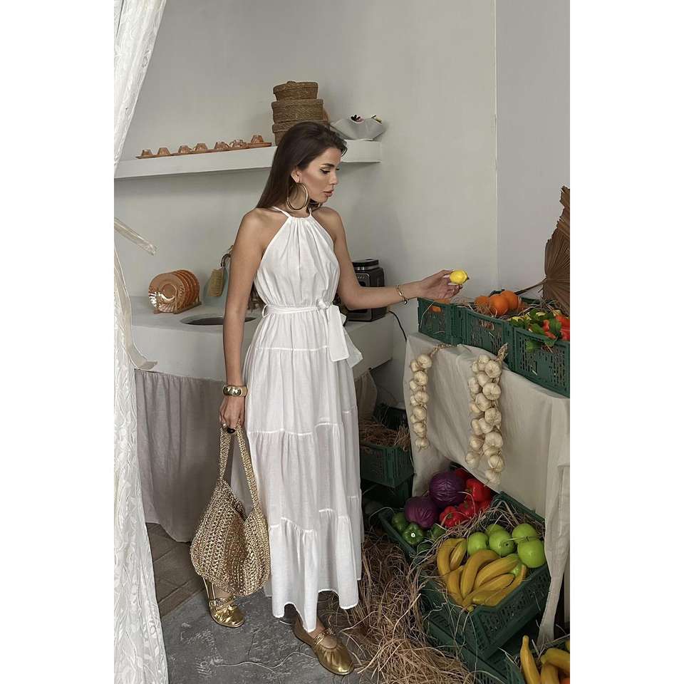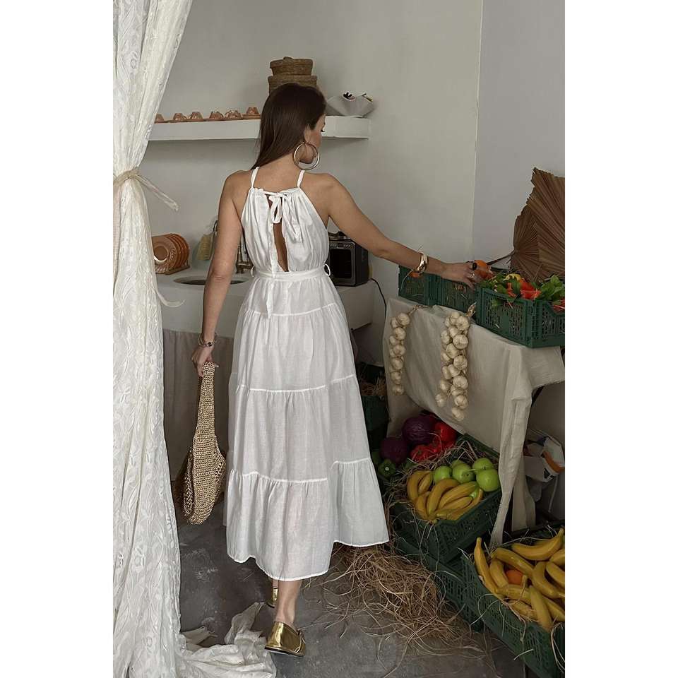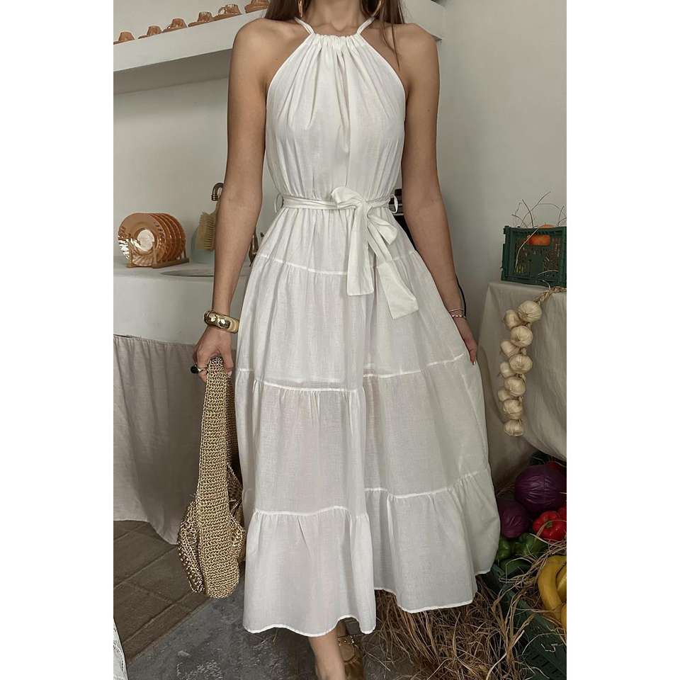 เดรสเอวสม็อคผูกโบว์ คอ halter ทรงเอไลน์ ผ้าทอระบายอากาศ ใส่สบายๆ ทุกวัน