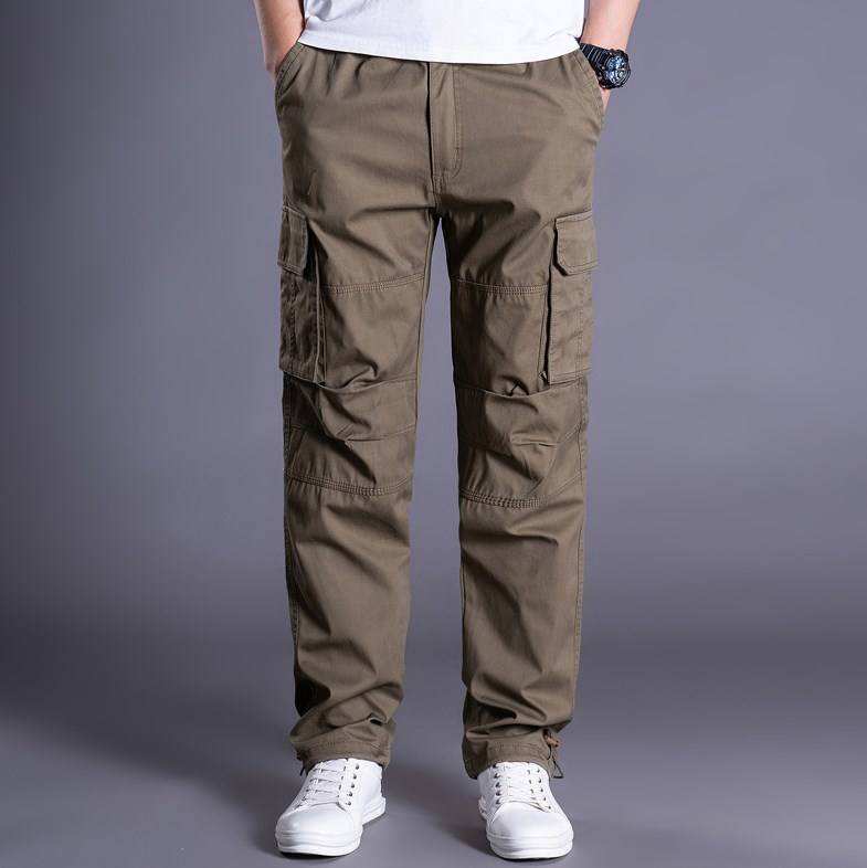กางเกงคาร์โก้สีกากีขาตรงแบบยืดได้กางเกงคาร์โก้ผ้าคอตตอนดีไซน์เรียบง่ายยาวปกติ