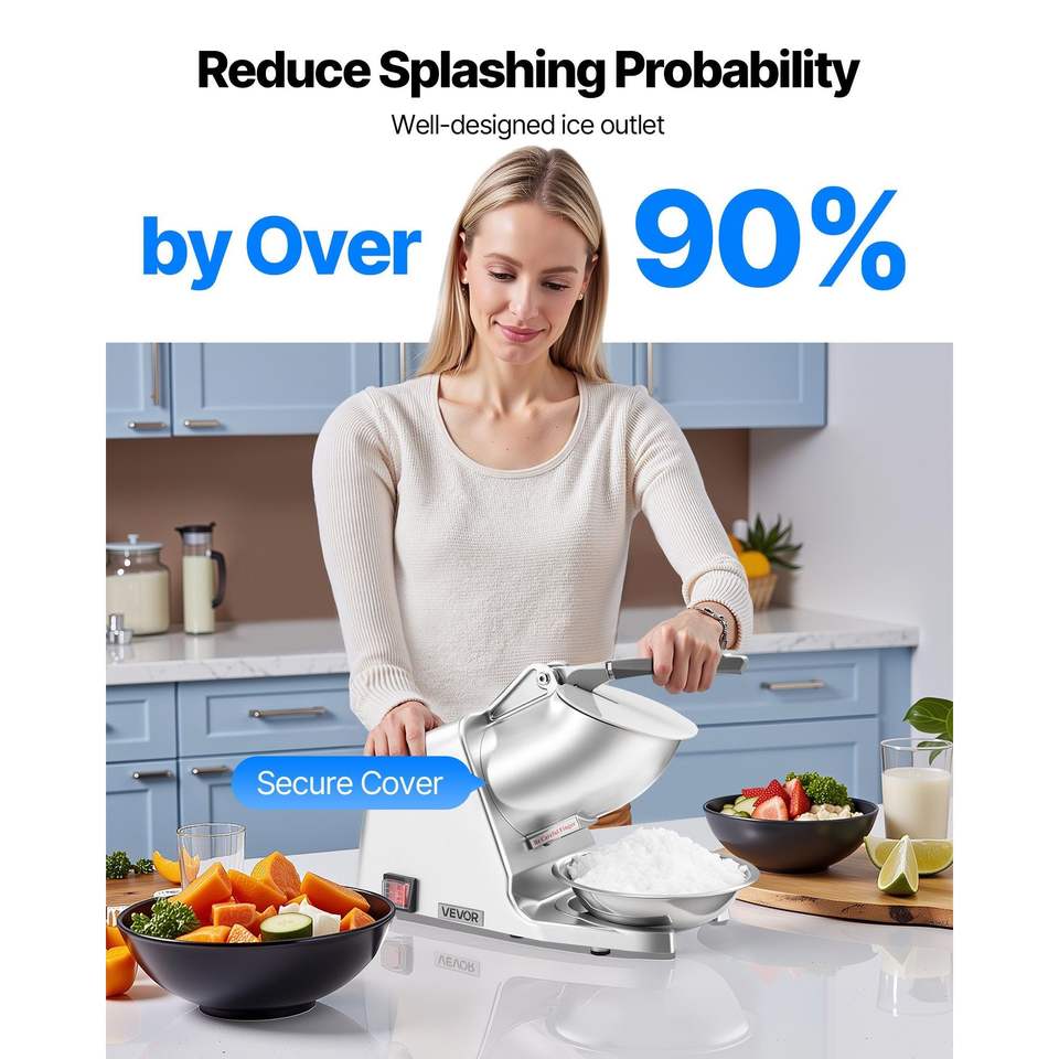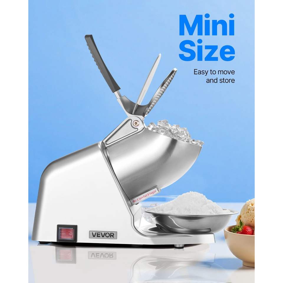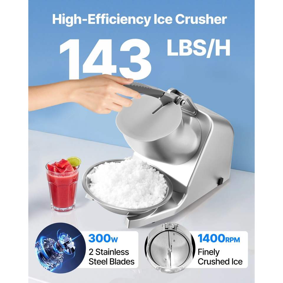 เครื่องบดน้ำแข็งไฟฟ้า 2 ใบมีด กำลังการผลิต 143 ปอนด์ต่อชั่วโมง ทำจากสแตนเลส พร้อมฝาครอบโถ ทำน้ำแข็งไส