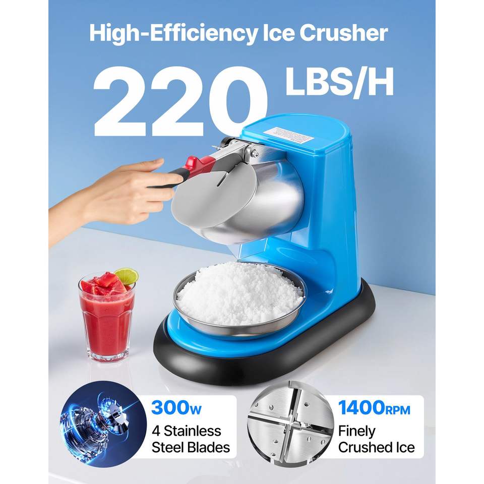 เครื่องบดน้ำแข็งไฟฟ้า 4 ใบมีด กำลังการผลิต 220 ปอนด์ต่อชั่วโมง ทำจากสแตนเลส พร้อมฝาครอบโถ สำหรับทำน้ำแข็งไส