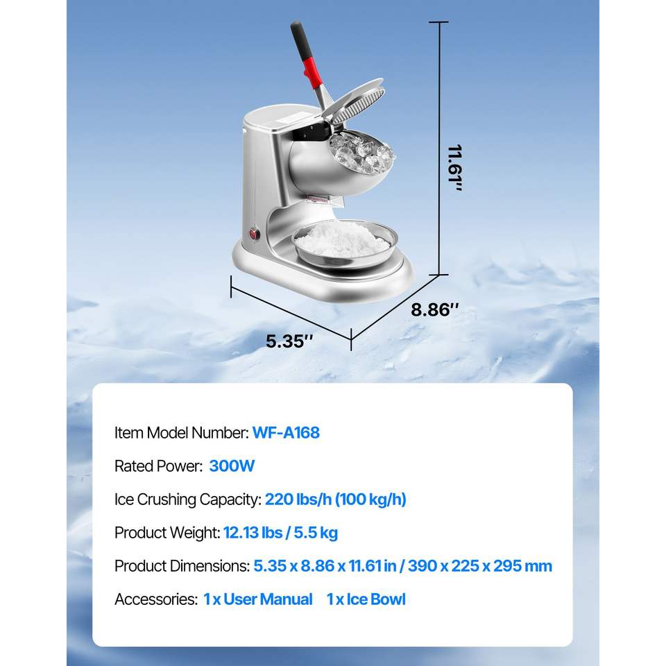 เครื่องบดน้ำแข็งไฟฟ้า 4 ใบมีด กำลังการผลิต 220 ปอนด์ต่อชั่วโมง ทำจากสแตนเลส พร้อมฝาครอบโถ สำหรับทำน้ำแข็งไส
