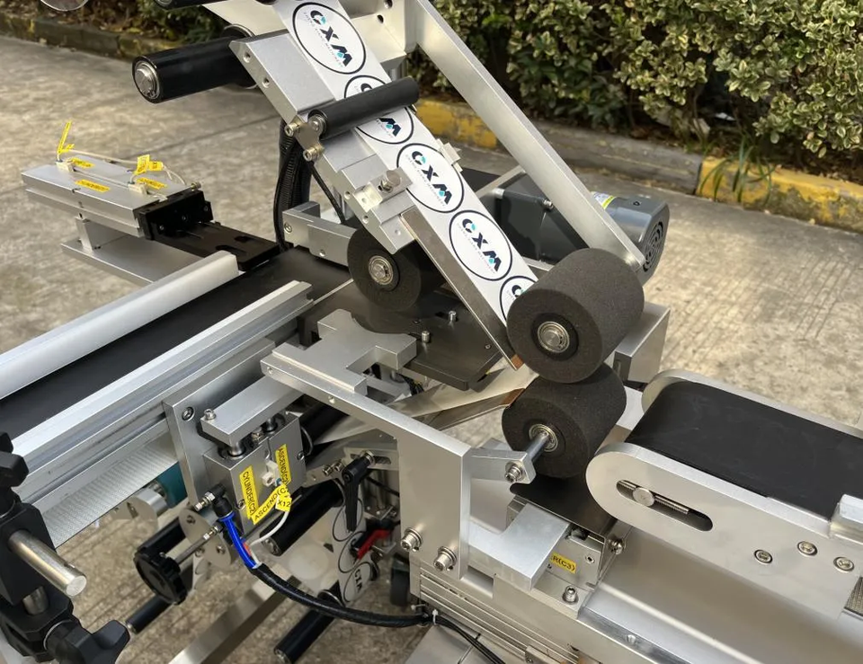 เครื่องติดฉลากอัตโนมัติแบบไฟฟ้า สำหรับติดฉลากด้านบนและด้านล่าง พร้อมระบบ PLC สำหรับกระป๋องทรงกลม ขวด และภาชนะขนาดเล็ก หน้าจอสัมผัสความแม่นยำสูง