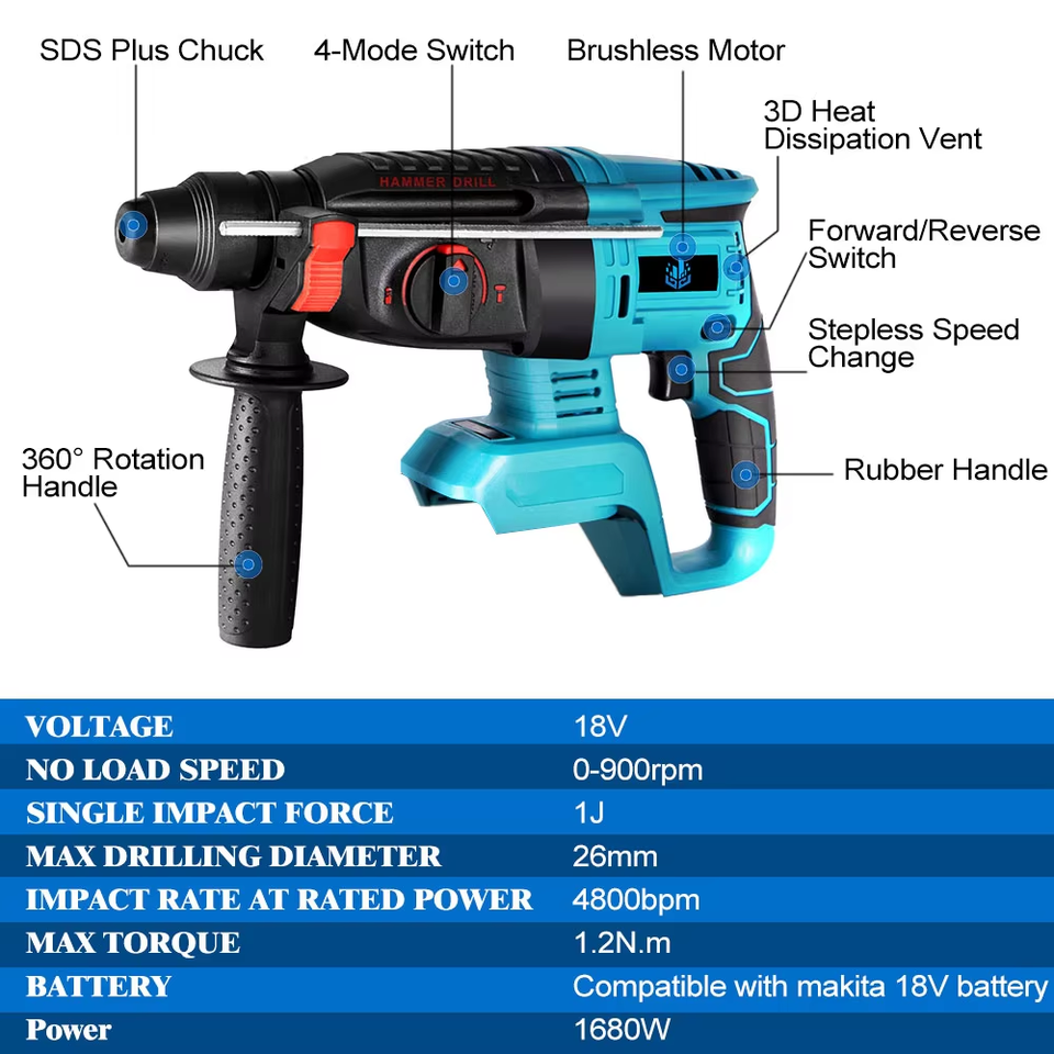 สว่านกระแทกไฟฟ้าไร้สายแบบมัลติฟังก์ชันค้อนไม้คอนกรีตไร้แปรงถ่าน