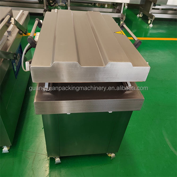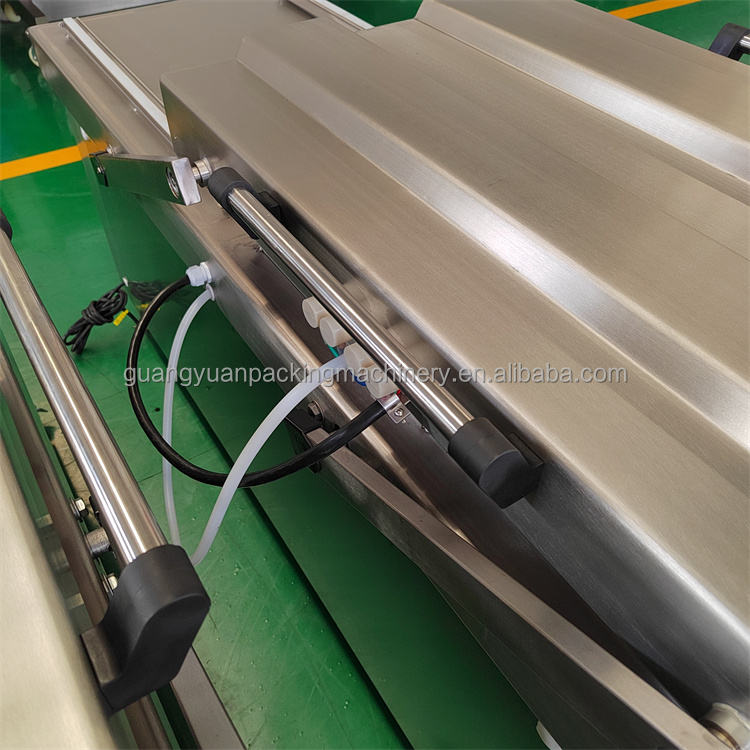 เครื่องบรรจุสุญญากาศสองช่องเครื่องบรรจุสเต็กหมูปลาแซลมอนแบบสุญญากาศสำหรับสายการผลิตเนื้อสัตว์
