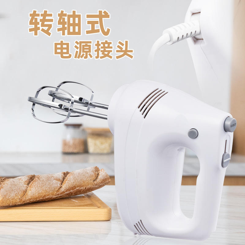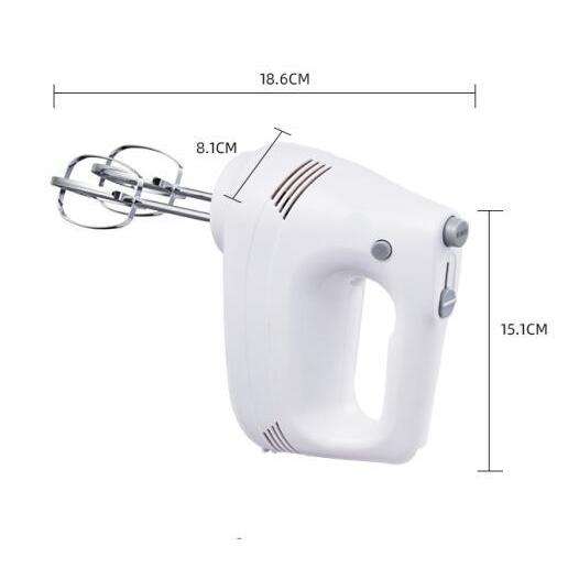 เครื่องผสมอาหารไฟฟ้า 250 วัตต์ ตัวเครื่องพลาสติกสีขาว ดีไซน์หัวเอียง สำหรับทำขนมอบที่บ้าน ผสมไข่ ตีครีม พร้อมหัวตีแบบลวด