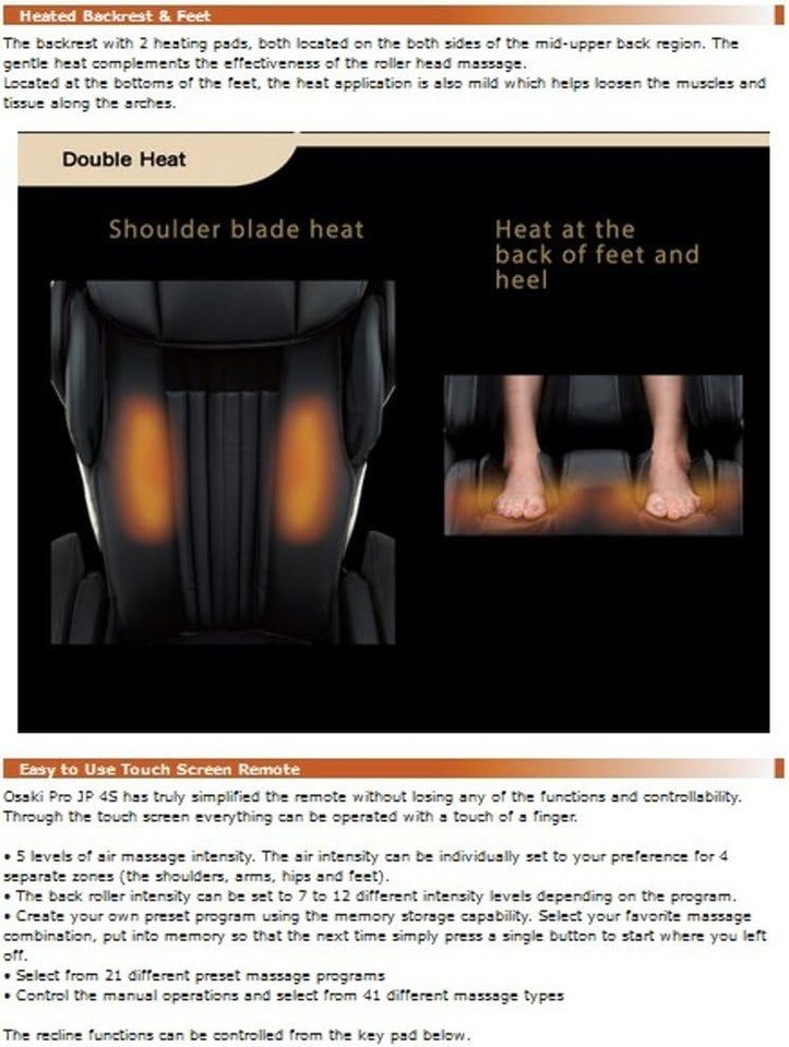 แบบพกพา, แรงโน้มถ่วงเป็นศูนย์, พับได้, การสั่นสะเทือน, นวดฝ่าเท้า, การดูแลสุขภาพ, เป็นมิตรกับสิ่งแวดล้อม, 4d manipulator, ประคบร้อน, sl tracking massage, ควบคุมเสียงอัจฉริยะ, ระบบบลูทูธ, การจัดการระยะไกลของคอมพิวเตอร์ลักษณะ