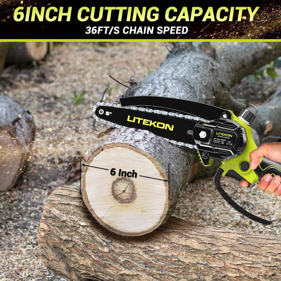 เลื่อยโซ่ไฟฟ้าไร้สายขนาดเล็กแบบมือถือ มอเตอร์แบบแปรงถ่าน บาร์นำโซ่ 6 นิ้ว 550 วัตต์ แบตเตอรี่ลิเธียม เครื่องมือ DIY OEM สำหรับตัดแต่งกิ่งไม้ในบ้าน