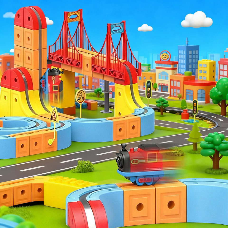 ชุดรถไฟฟ้าแบบทำมือพร้อมรถไฟและป้ายจราจรรางแข่งแบบปริศนารถไฟแม่เหล็ก